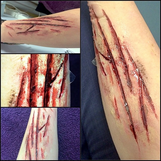 Wounds made with sculpt gel and filled with fake blood, "glass" shards made with sheets of gelatin