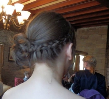 Bridesmaid hair, lace braid into a messy bun