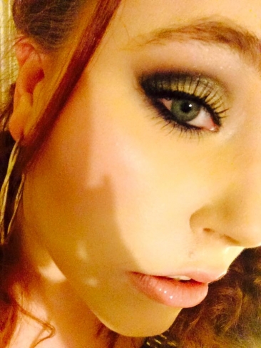 Big curly bun and smokey green eyes