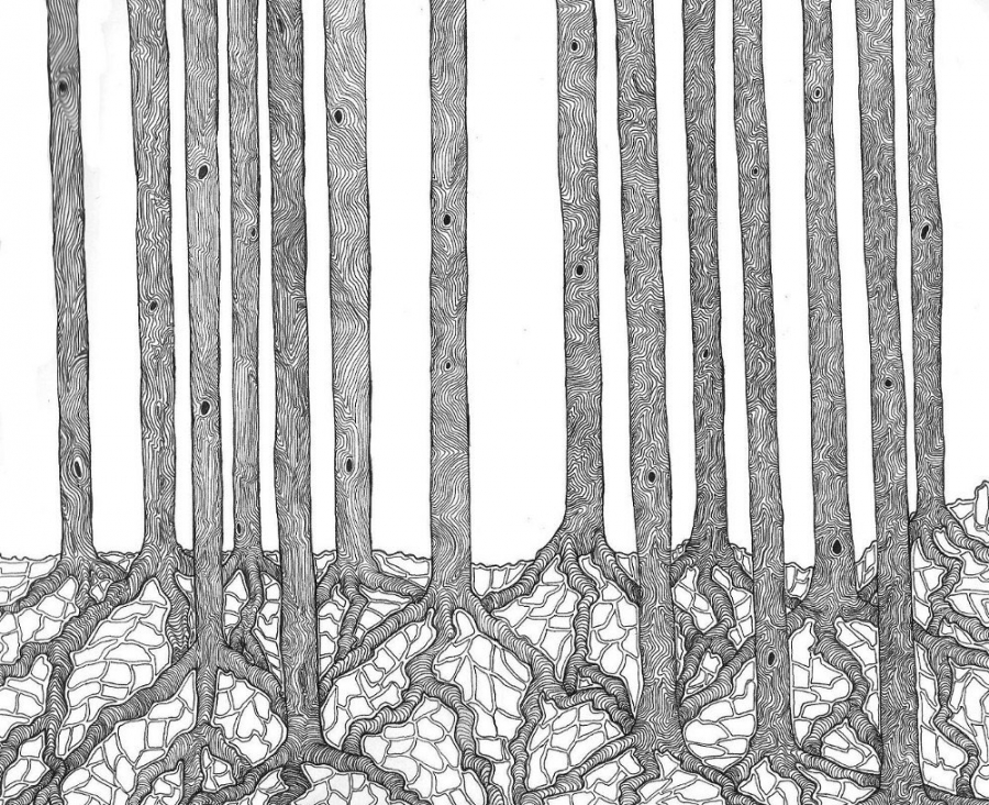 Ink drawing on paper of a collection of symmetrical trees