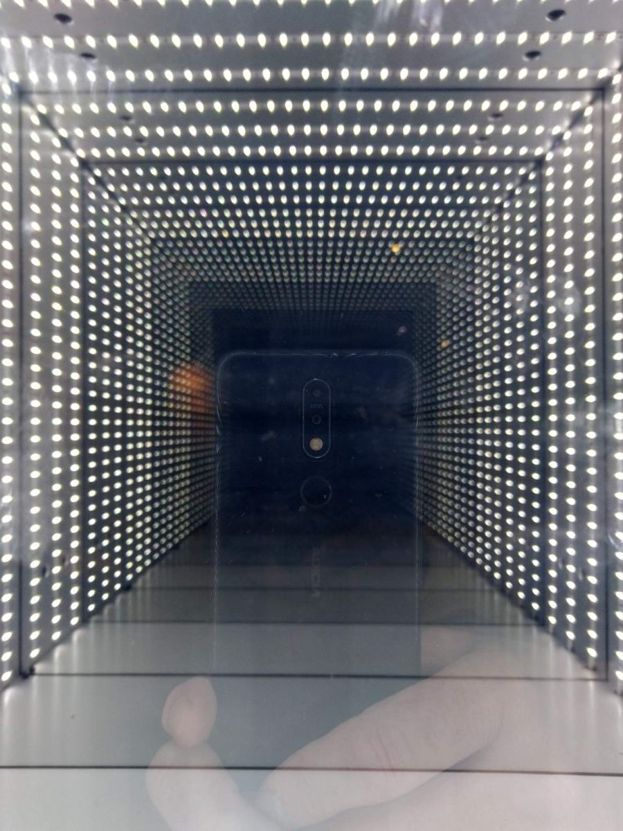 Self portrait taken on mobile phone in tunnel of led lights