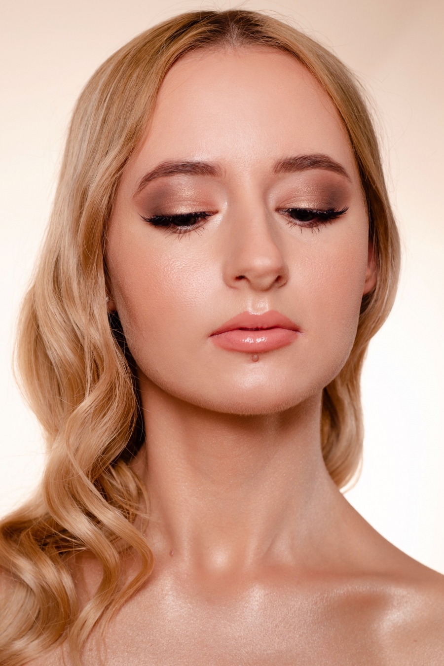 Delicate brown Smokey bridal makeup with natural and fresh look skin. Delicate nude lips with glossy finish.