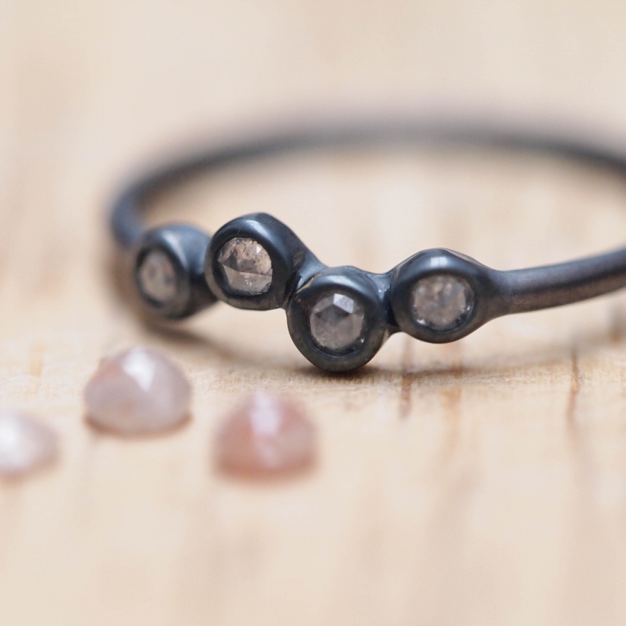 Oxidized sterling silver ring with four rose cut white diamonds.