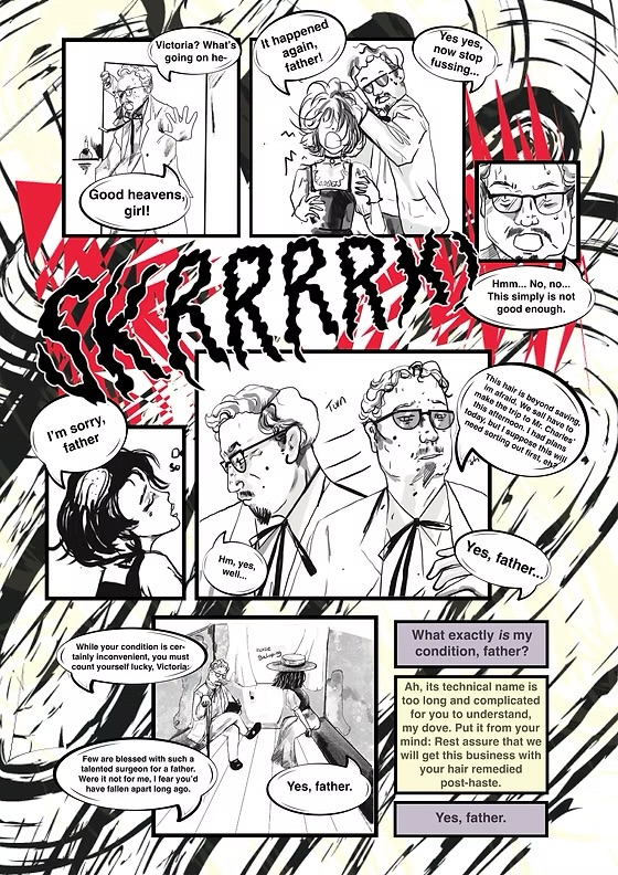 Collaborative project for a comic book crooked seams. My partner illustrated the scenes and I did the layout, page design and typography.
