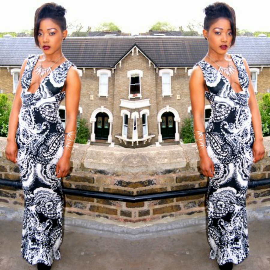 This is a long V shaped maxi dress that enhance your body shape in a chic and bold way. A creative black & white print with a luxury soft touch.