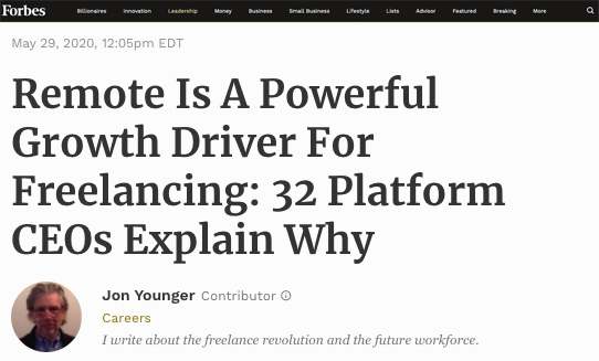 Freelancer Club is one of the leading voices in the self-employed space. In addition to speaking on the freelance landscape, we are often quoted on the future of work, remote working, distributed teams, and the agile workforce. Quoted in Forbes, our CEO and Founder, Matt Dowling, along with 31 other leaders give their insights on remote working and how they utilise it.